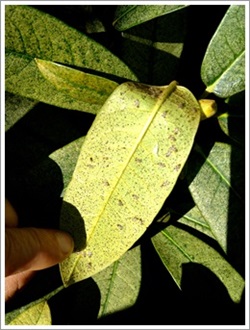 Lace bug are a small piercing sucking insect that have reached in my opinion epidemic numbers in many areas of Portland. They will be on the underside of rhododendron and Azalea leaves. There attack sites cause brown tar spots on the underside of the leaves and stippling on the tops which will eventually merge into an almost solid yellow/white color at which point the host has a very hard time processing the suns supportive rays. If left untreated they will eventually cause plant fatality.